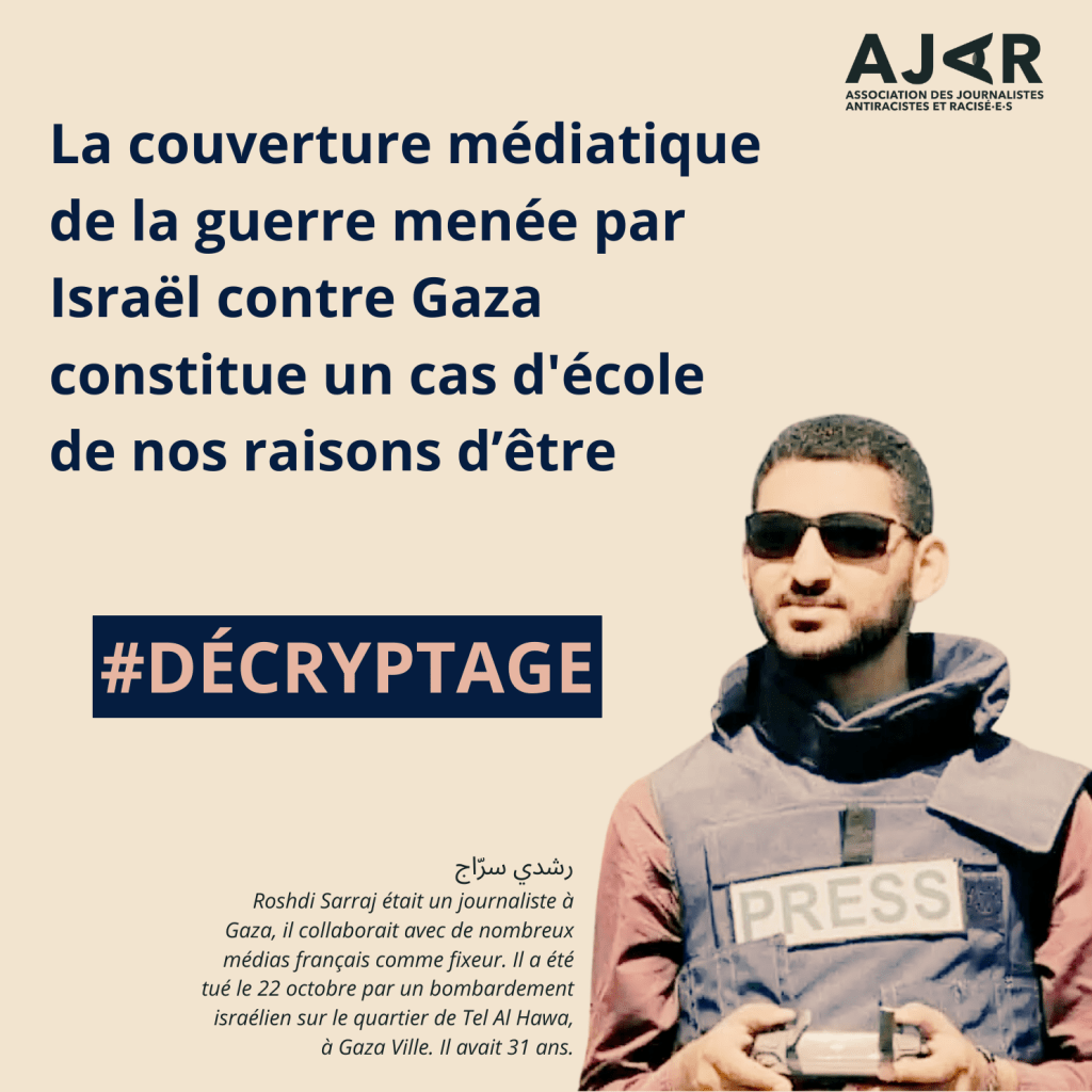 Reprise des éléments de langage de l’armée israélienne sans mise à distance, déshumanisation des Palestinien·nes, demandes de condamnations asymétriques, effacement du contexte, sans oublier le racisme dans les rédactions : la couverture du conflit israélo-palestinien constitue un cas d’école des raisons d’être de l’Association des journalistes antiracistes et racisé·e·s (AJAR).